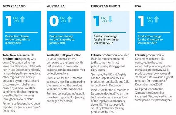 最近,恒天然(Fonterra)在其官網(wǎng)上披露了2018年2月最新財(cái)務(wù)數(shù)據(jù),公司今年1月國內(nèi)牛奶產(chǎn)量同比下降5%,原因是“糟糕的天氣狀況導(dǎo)致土壤濕度不夠,進(jìn)一步影響了牧草生長和奶牛產(chǎn)奶”。