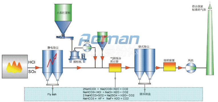 煙氣中含有大量的酸性氣體,經(jīng)過(guò)大量的數(shù)據(jù)和實(shí)驗(yàn),只有碳酸氫鈉(小蘇打, NaHCO3)小到一定的程度,其才能和煙氣中的酸性成分產(chǎn)生較大效率的反應(yīng)。它通過(guò)化學(xué)吸附去除煙氣中的酸性污染物,同時(shí)還可通過(guò)物理吸附去除一些無(wú)機(jī)和有機(jī)微量物質(zhì)。此工藝將碳酸氫鈉細(xì)粉直接噴入高溫?zé)煔?。在高溫下碳酸氫鈉分解生成碳酸鈉Na2CO3、H2O和CO2。