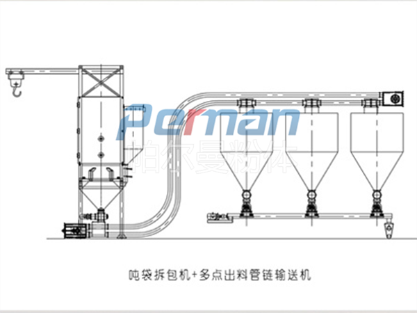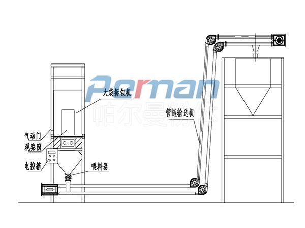 生產(chǎn)原材料會(huì)在皮帶輸送的作用進(jìn)行進(jìn)入到無(wú)塵拆包機(jī)中進(jìn)行拆包作業(yè),分離出的散料會(huì)在出料口直接進(jìn)入到管鏈輸送機(jī)設(shè)備入料口中進(jìn)行傳輸作業(yè)。